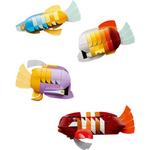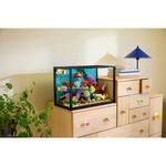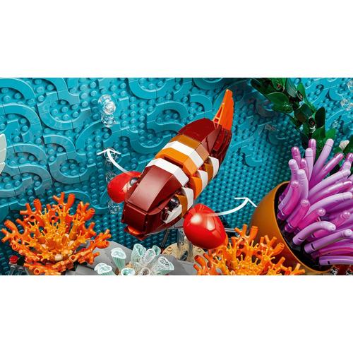 This home decor aquarium comes with fun functions. Rotate the dials and cranks to animate a swimming fish, swaying coral, a crab emerging from an underwater cave and an opening treasure chest. The aquarium includes 4 model fish and comes with a variety of plants and coral, sea worms and an oyster shell containing a pearl, plus LEGO sea snails and air bubbles.