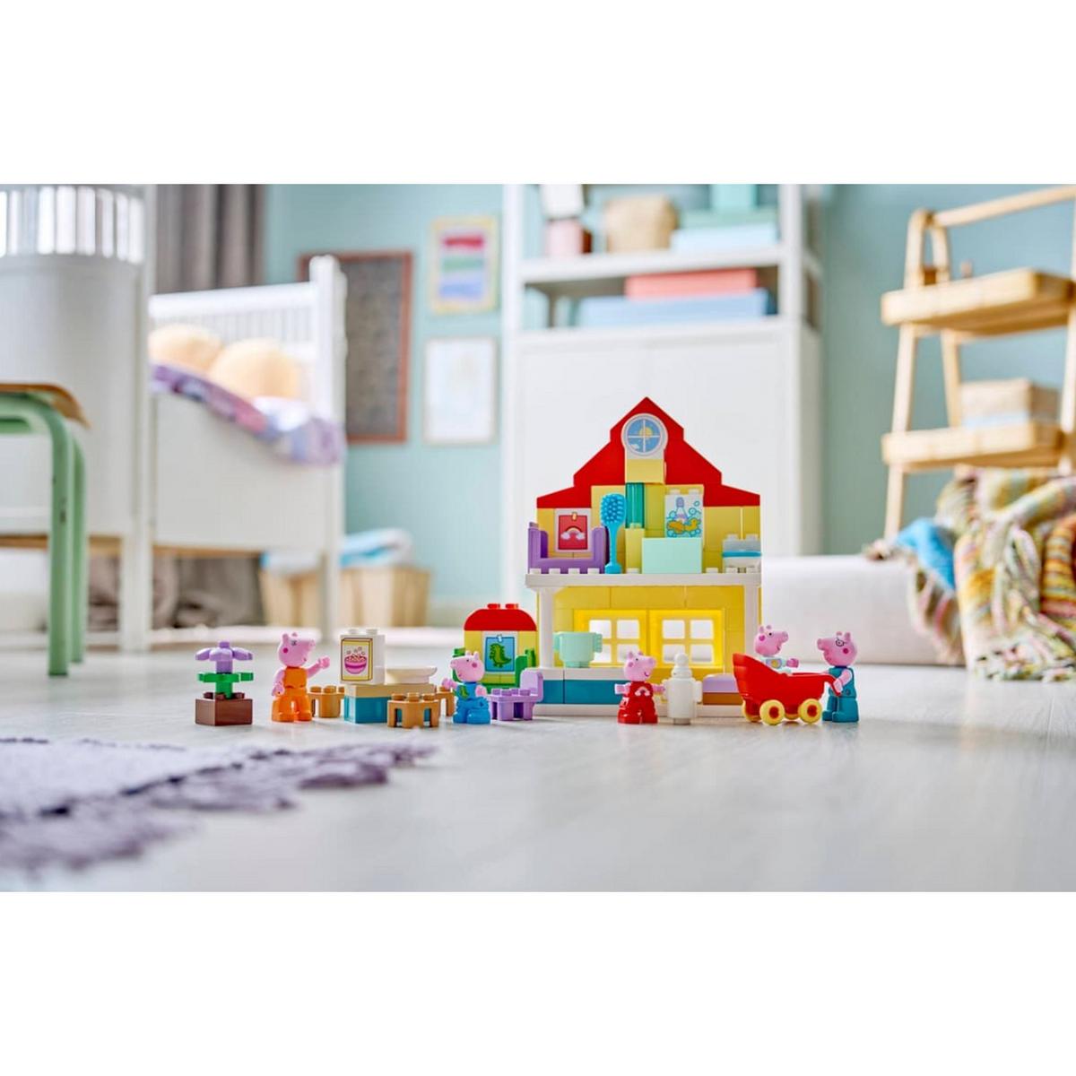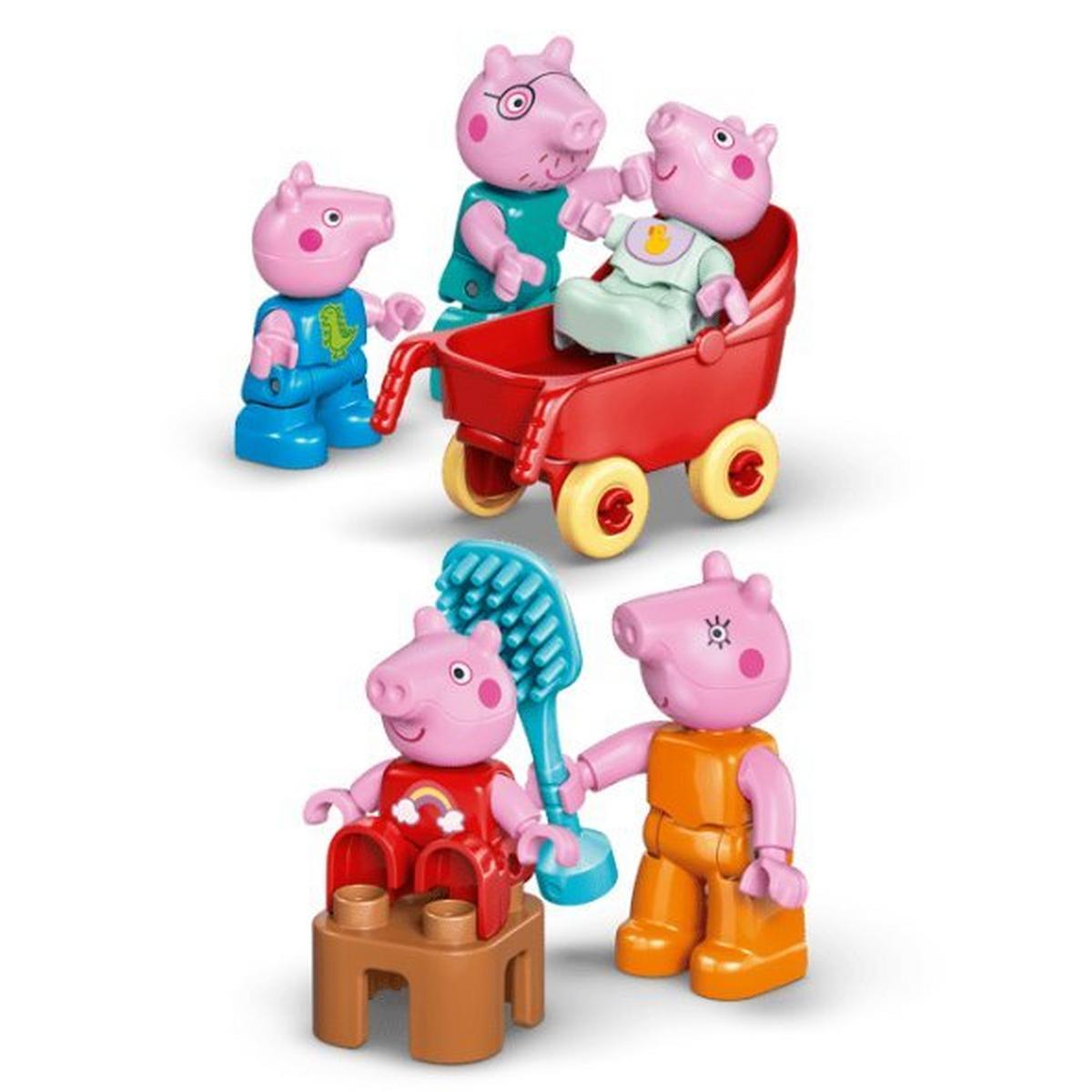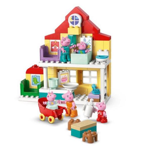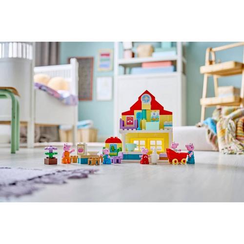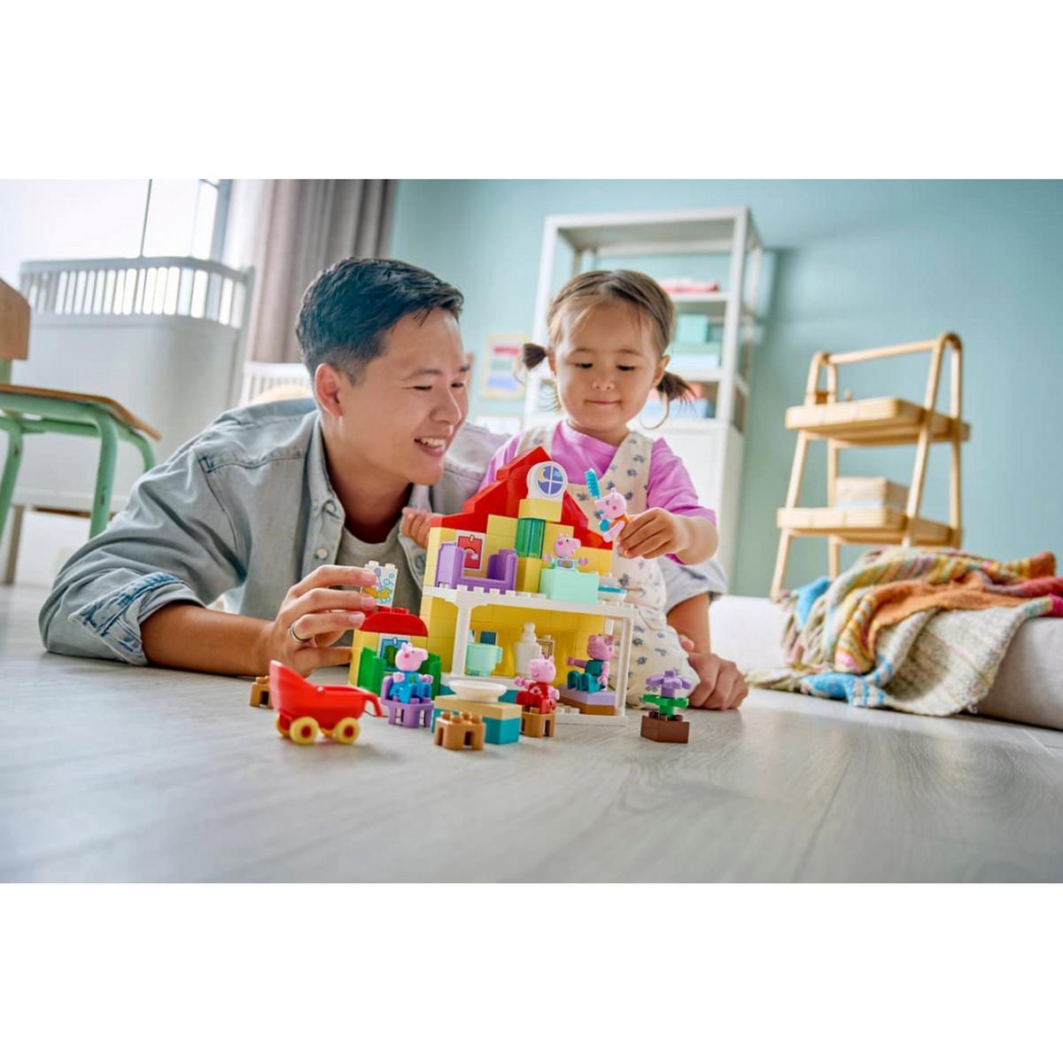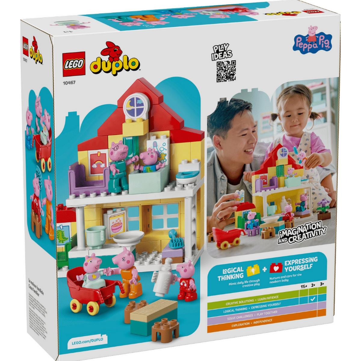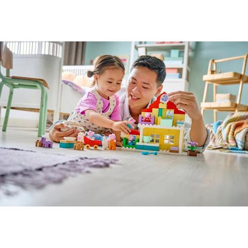 Toddlers play out routines alongside their favorite TV characters with the Peppa Pig Family House (10467) building kit. This toddler gift for girls and boys ages 2 and up includes the full family of 5 Peppa Pig characters including Evie Pig. Like in the show, this 2-level LEGO® DUPLO® toy house has separate rooms for George and Peppa Pig, a kitchen, bathroom and lounge. This pretend play toy encourages young girls and boys to recreate scenes from the show and routines from their own home, suchas getting ready for bed, or having a family breakfast. With this building set’s 5 LEGO DUPLO figures – Mummy Pig, Daddy Pig, George, Evie and Peppa Pig – kids can grow their emotional intelligence as they imagine having a new family member. Packedwith accessories for imaginative play, this toddler learning toy lets little builders imagine caring for the baby by taking her for a walk in the stroller, feeding her with the bottle or giving her a bath. Contains 84 pieces.