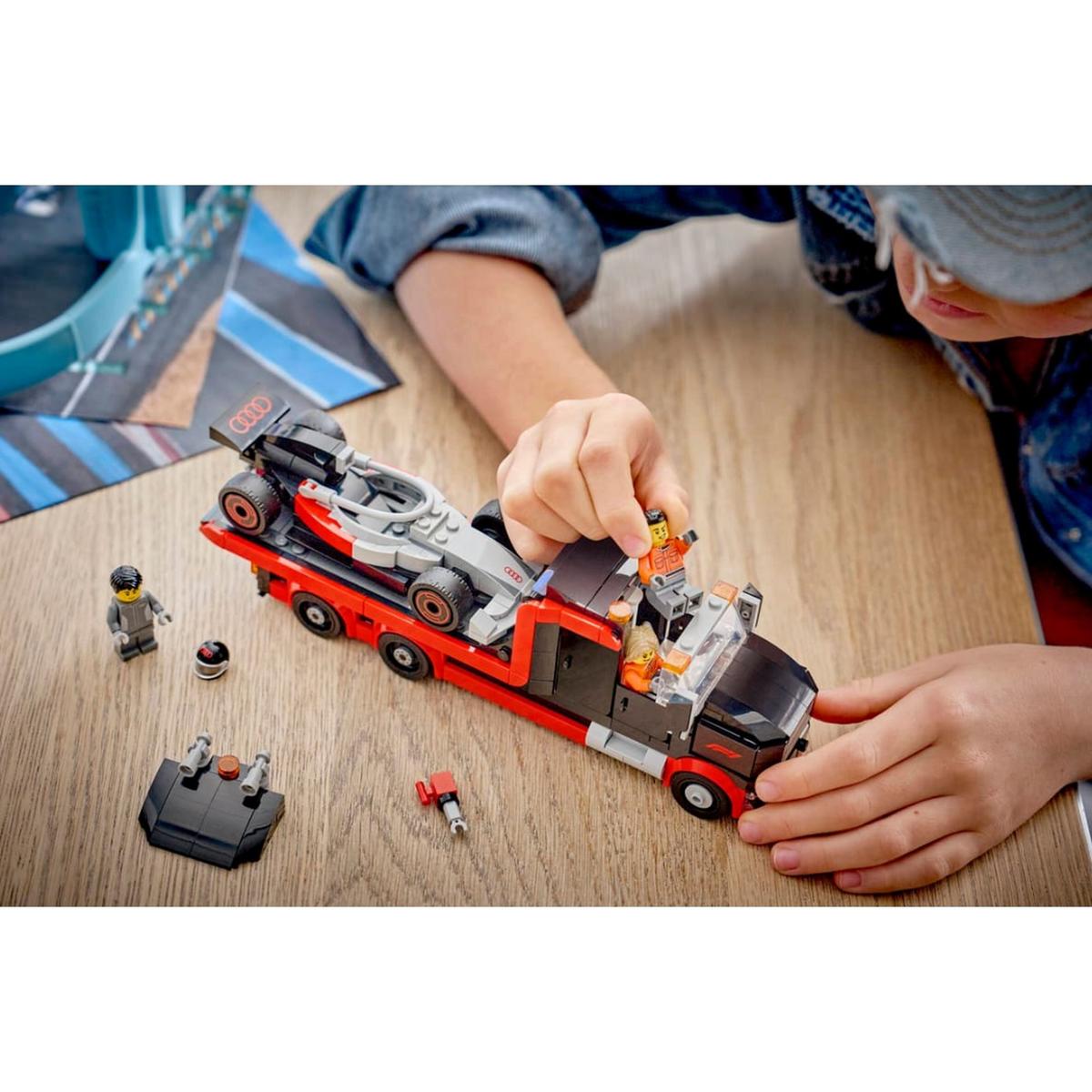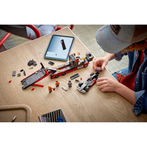 Racing fans aged 7+ can enjoy epic motorsport action with the LEGO® City F1® Display Truck with Audi F1® Race Car (60493) set. This premium-quality toy car building kit includes an authentic Audi F1® car model with slick rubber tires and a detailed cockpit, plus a truck toy with a driver cab, storage compartments, engine bay, 6 rubber tires and a lifting platform for unloading the toy Audi F1® car from the truck to track level. The set comes with an Audi driver and 2 pit crew LEGO minifigures, plus F1-themed accessories for imaginative play and display. This vehicle toy playset makes a great gift for 7-year-old boys, girls and kids who love F1 racing and creative building fun. Discover the dynamic lineup of F1-themed LEGO building sets for kids and adults. With this LEGO F1 playset, kids can enjoy intuitive building with the LEGO Builder app, zooming and rotating with 3D instructions while saving and tracking progress. Set contains 508 pieces.