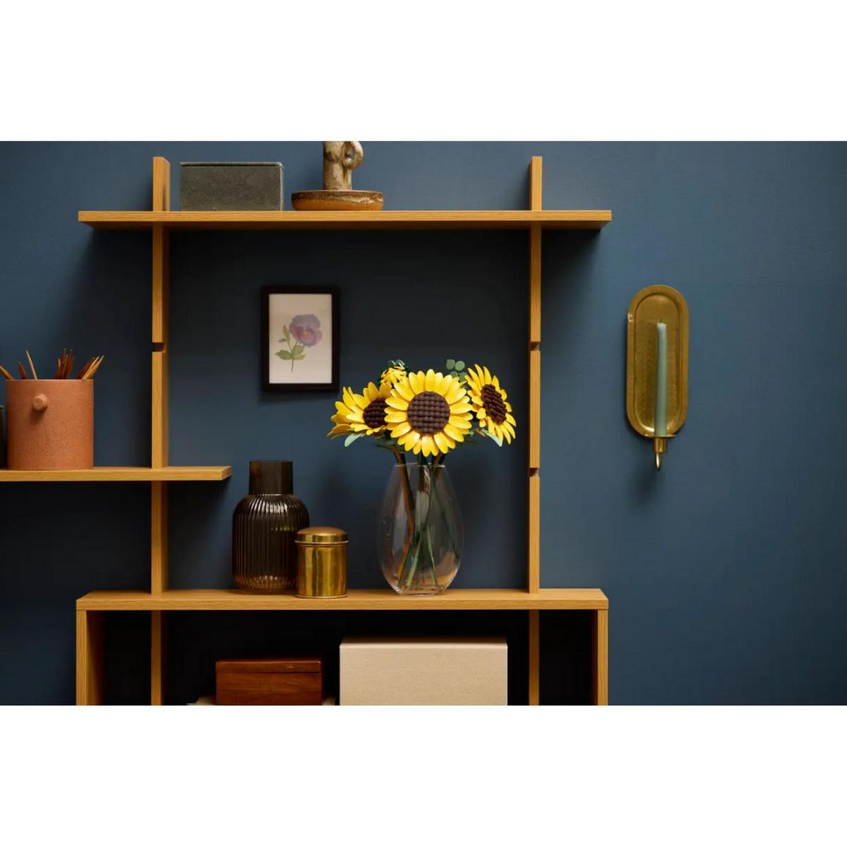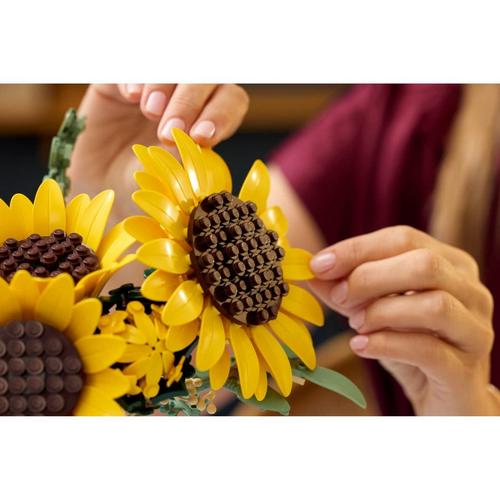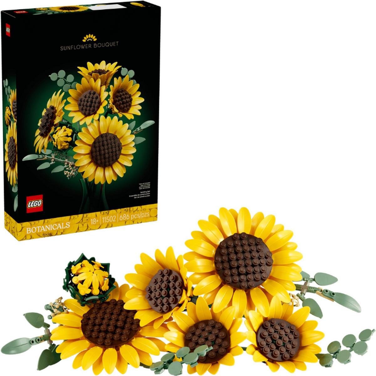 Let your creativity bloom with the LEGO® Botanicals Sunflower Bouquet (11502) building set for adults. This gorgeous LEGO bouquet includes 6 sunflowers in various stages of development. Enjoy creating 1 sunflower bud, 3 sunflowers beginning to bloom and 2 big fully opened sunflowers, plus 4 stems of eucalyptus. These LEGO flowers are designed to be highly realistic and the petals and stems are adjustable so budding florists can arrange the plants into a bespoke bouquet and display it proudly as flower decor. It can also be combined with other LEGO Botanicals sets (sold separately) to create a larger, customized floral display. Sunflowers are thought to represent positivity, love and luck, so this LEGO building kit makes a thoughtful birthday, Valentine’s Day, Mother’s Day or housewarming gift for women, men and nature lovers. It’s also available in the LEGO Builder app, where builders can rotate their builds and track their progress. Set contains 686 pieces.
